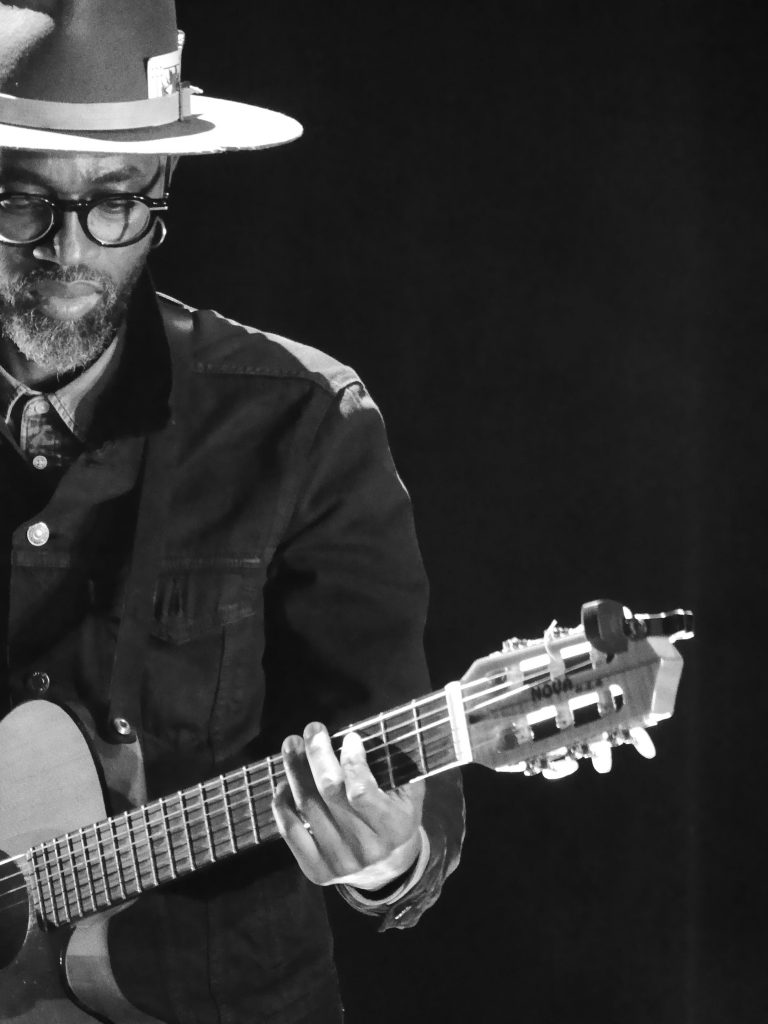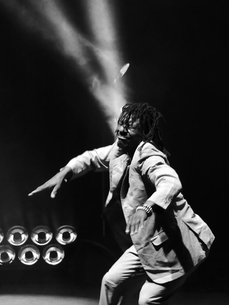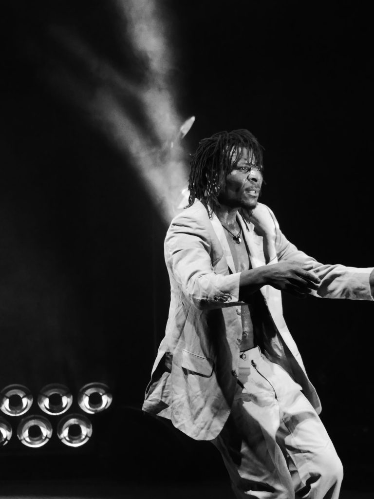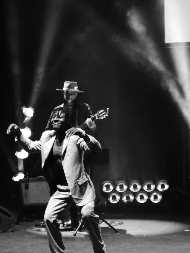 En présence du performeur Benjamin Kimpari, cette création inédite mêlant chant, guitare et danse convoque nos imaginaires et allie les riffs sophistiqués, imprégnés de sonorités angolaises du guitariste Lameck, aux chants de Lulendo.
